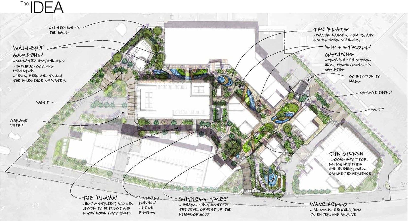 Located adjacent to the Aventura Mall, Esplanade at Aventura offers visitors a new way to socialize, shop, and dine. We identified three guiding principles–Cosmopolitan Lifestyle, Tropical Abundance, and Artistic Expression–to ground design and programming decisions. At Esplanade, the landscape takes center stage with a green ribbon of tropical landscapes encouraging movement throughout the site. The design maximizes its 82,000 square feet of planted area to create an immersive environment that contributes to its premier aesthetic, while mitigating heat and humidity. The colorful, textured landscape includes 27,000 shrubs, groundcovers, and bromeliads that emphasize diverse species well-adapted to the local climate. Crucial to Esplanade’s design was the preservation and enhancement of the tree canopy, now extending over 100,300 square feet, that provides shade and improves comfort and usability. The precise selection of trees features 191 palms and 242 canopy and ornamental trees, including over 30 that were relocated on-site to preserve existing mature specimens.