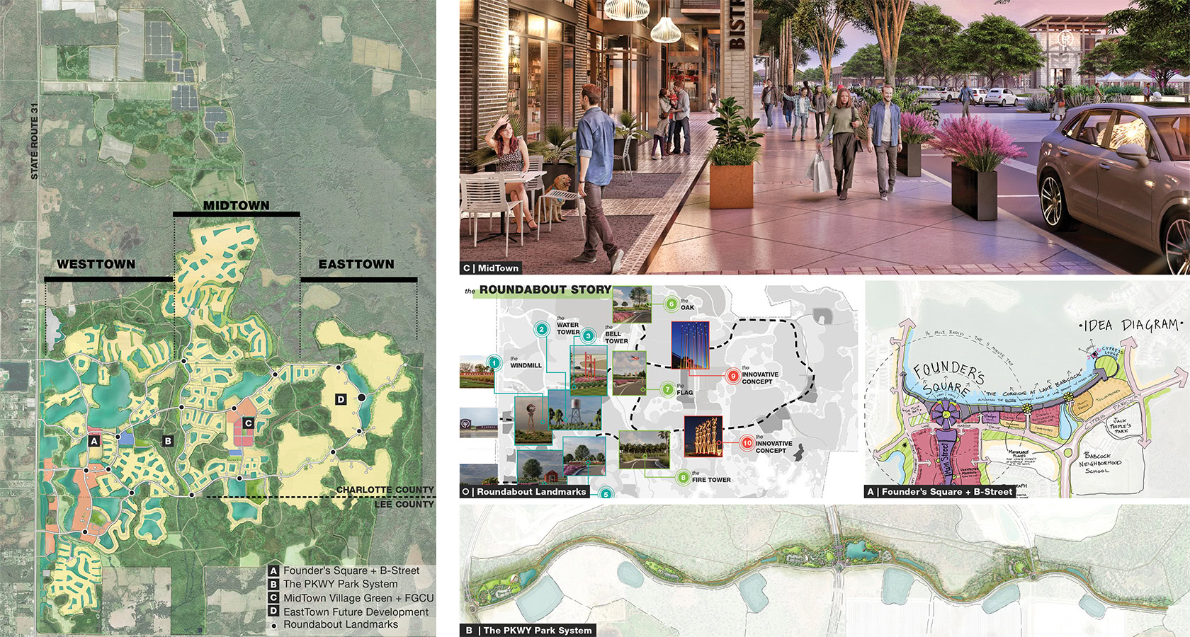 Babcock Ranch is more than a solar-powered town: it’s a bold redefinition of what hometown means. Working in tandem with Kitson’s residential and commercial teams, we clarified the land use, development program, circulation, and, ultimately, the everyday experience of residents. We established a clear framework for three distinct “towns” within Babcock Ranch: WestTown, anchored by Founders Square as the village center, MidTown, envisioned as the urban downtown, and EastTown, a destination defined by its environmental connections.
