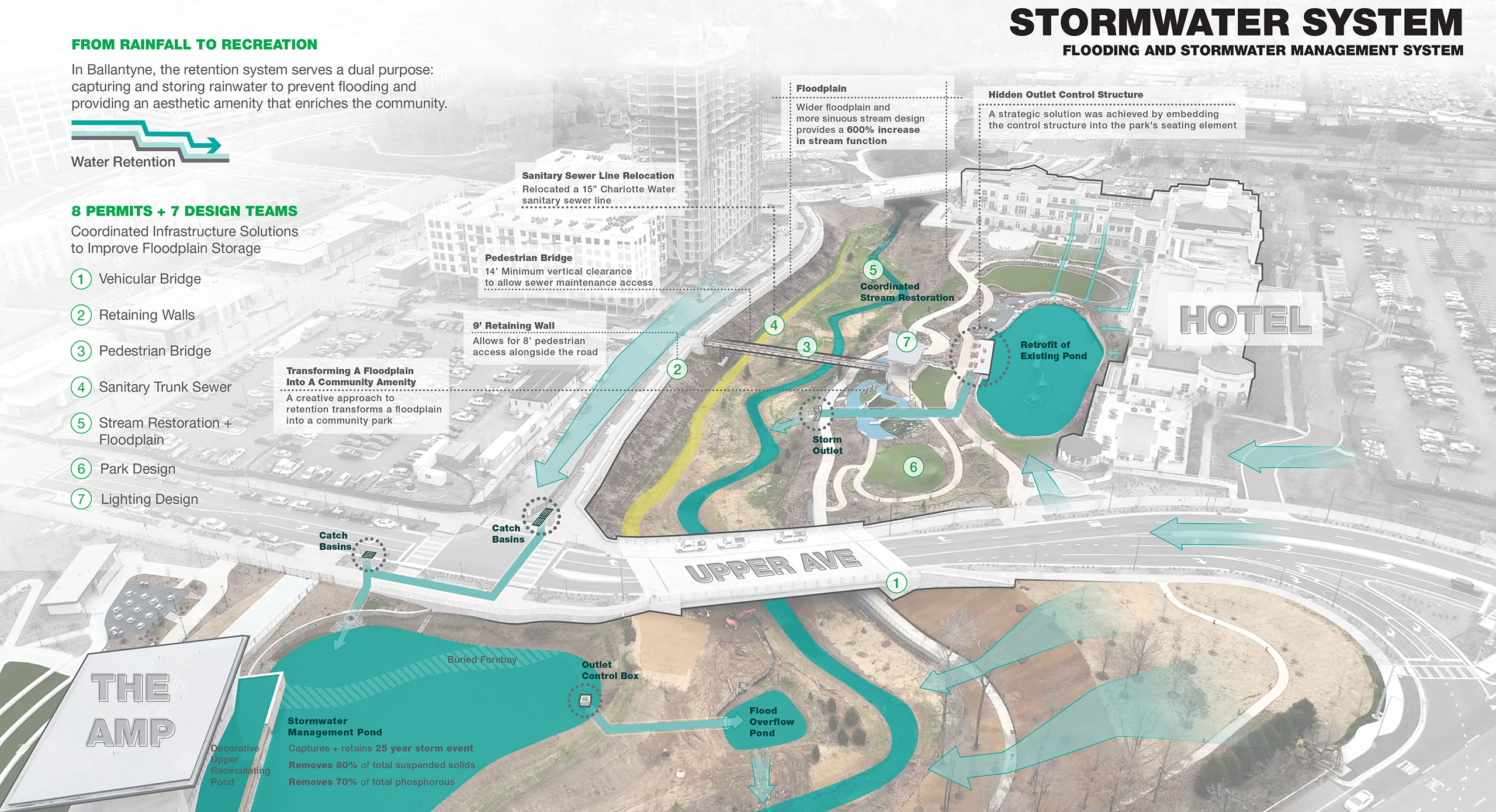 Ballantyne Reimagined integrates innovative stormwater solutions that marry function with beauty. The system skillfully manages overflow during heavy rains through the amenity flood pond and the restored stream at Stream Park, providing essential flood storage and supporting aquatic life. Additionally, it includes an integration with the Charlotte Water Sanitary Sewer line, exemplifying dual-purpose infrastructure that enhances the district’s functionality and aesthetics.