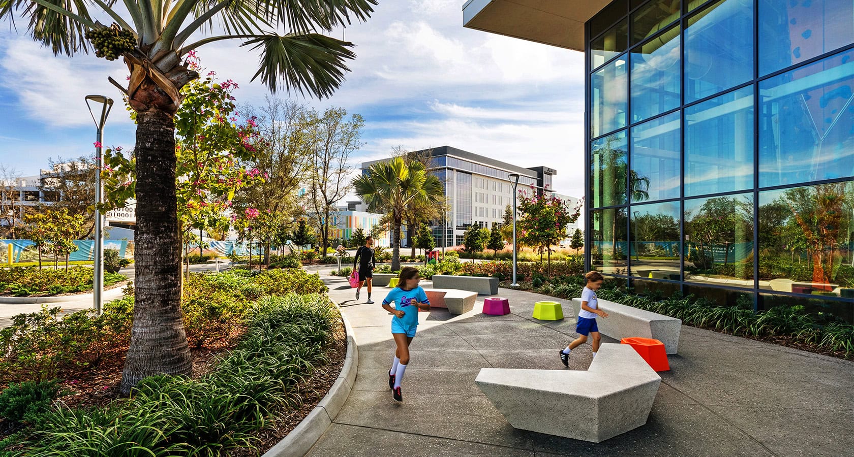 Integrating landscapes that respond to Central Florida’s climate through dense planting, natural shade, and materials that balance performance with visual identity