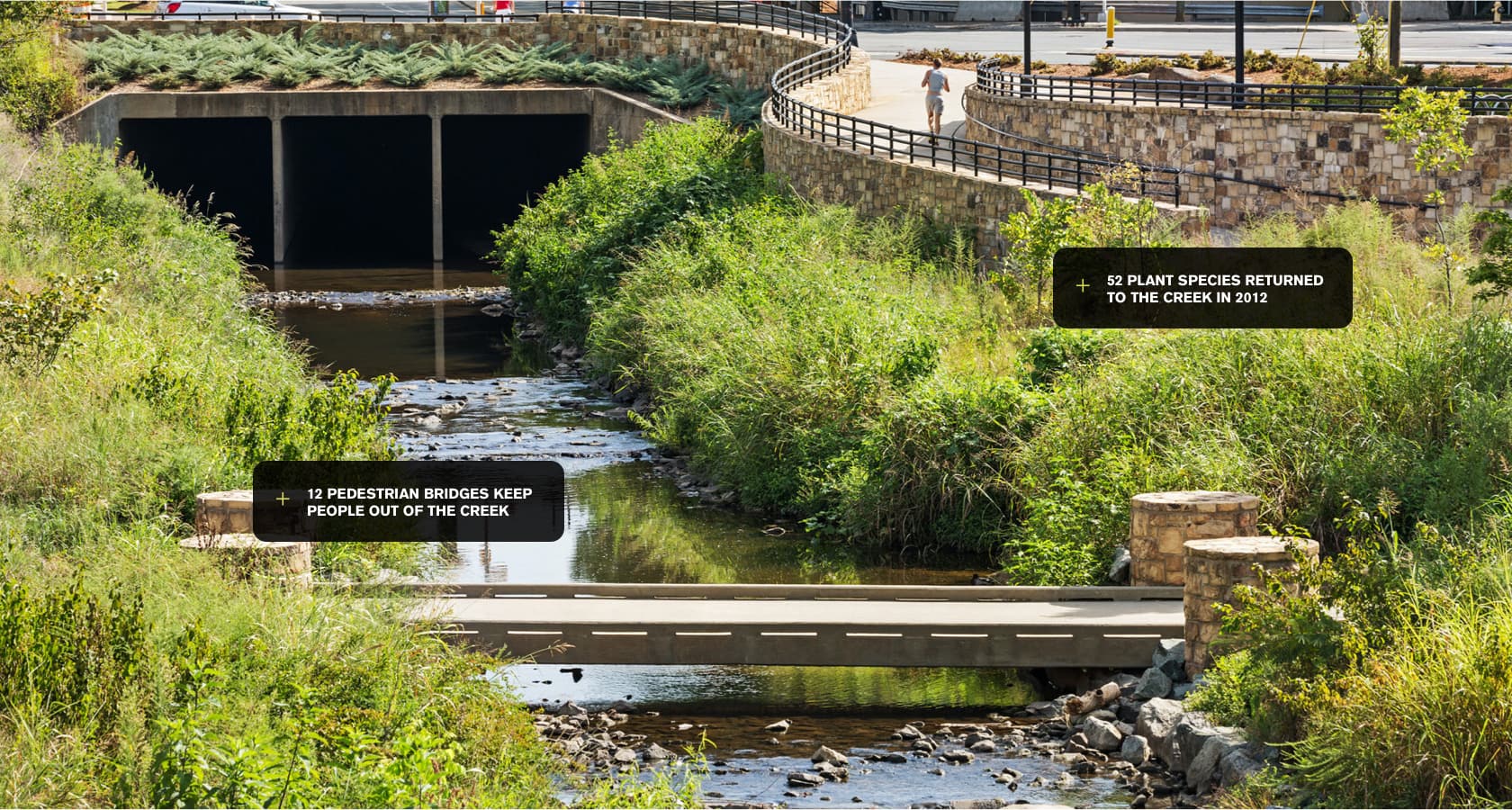 LandDesign worked side by side with public and private developers to reverse the mindset of the creek as a ‘back-door,’ so that new developments would orient to the greenway.