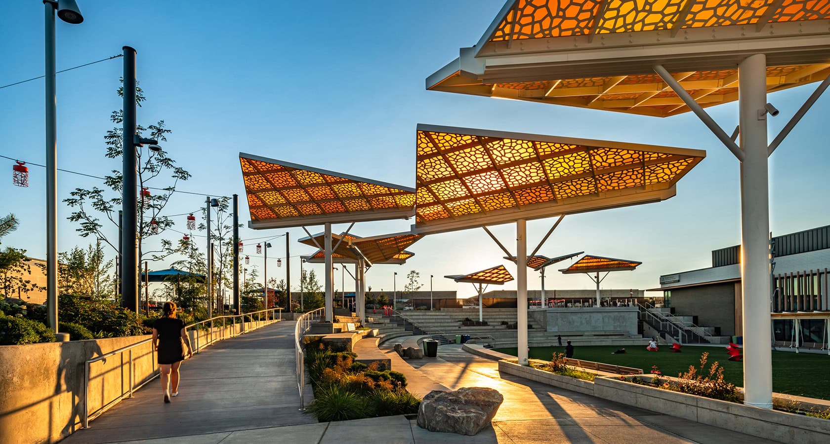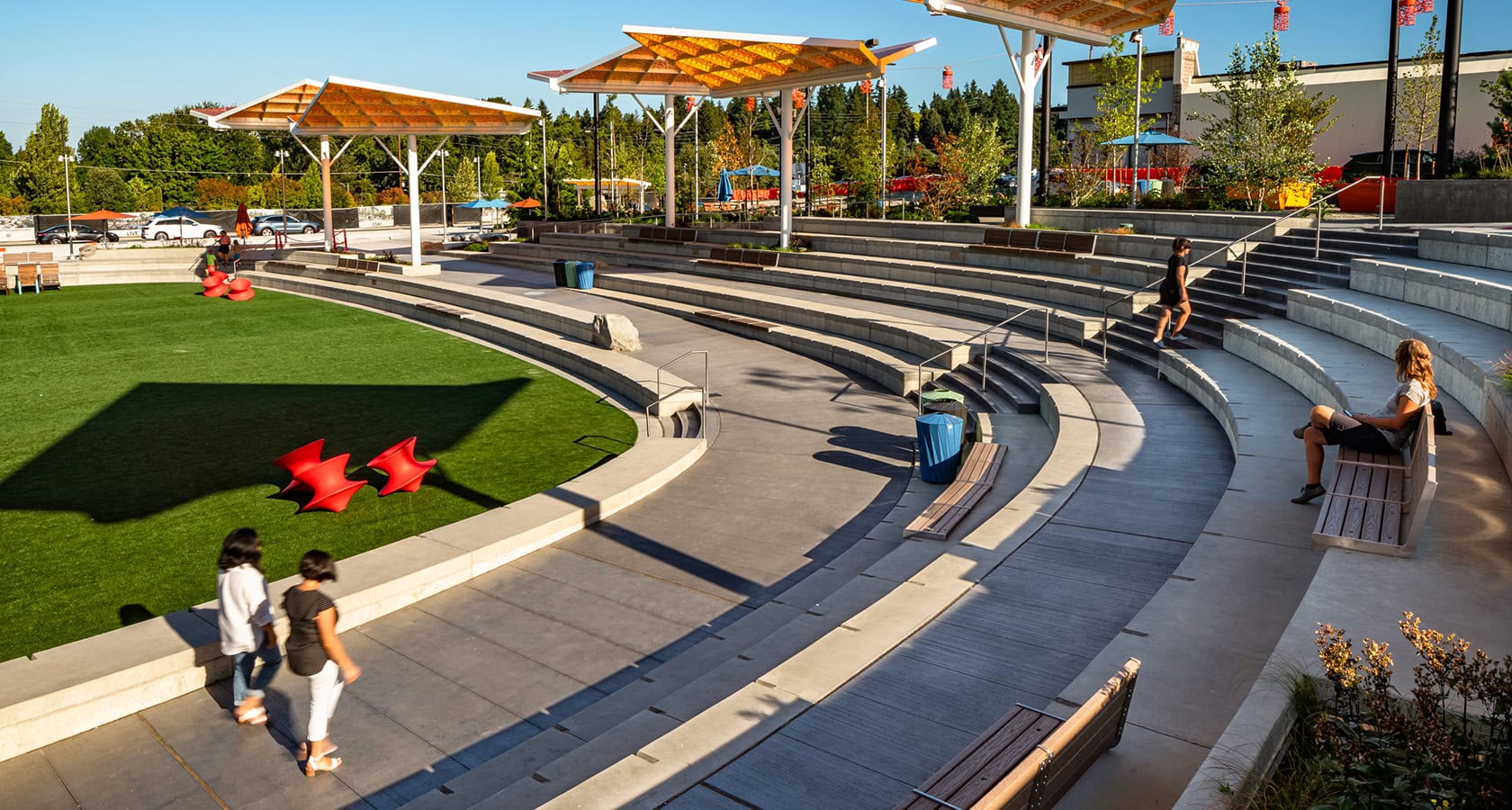 On the grounds of the former Northgate Mall in Seattle, a local destination since 1950, legacy is renewed with new open space: Northgate Station’s Central Park. The 1.2-acre park is at the center of the planned Northgate Station mixed-use development and fills a significant gap in Seattle’s open space network. Among the features are an expansive synthetic turf lawn for flexible programming; amphitheater seating providing optimal views of performances; custom canopy structures that double as rainwater collection devices; and colorful furniture for a vibrant foundation to the park environment throughout the seasons.