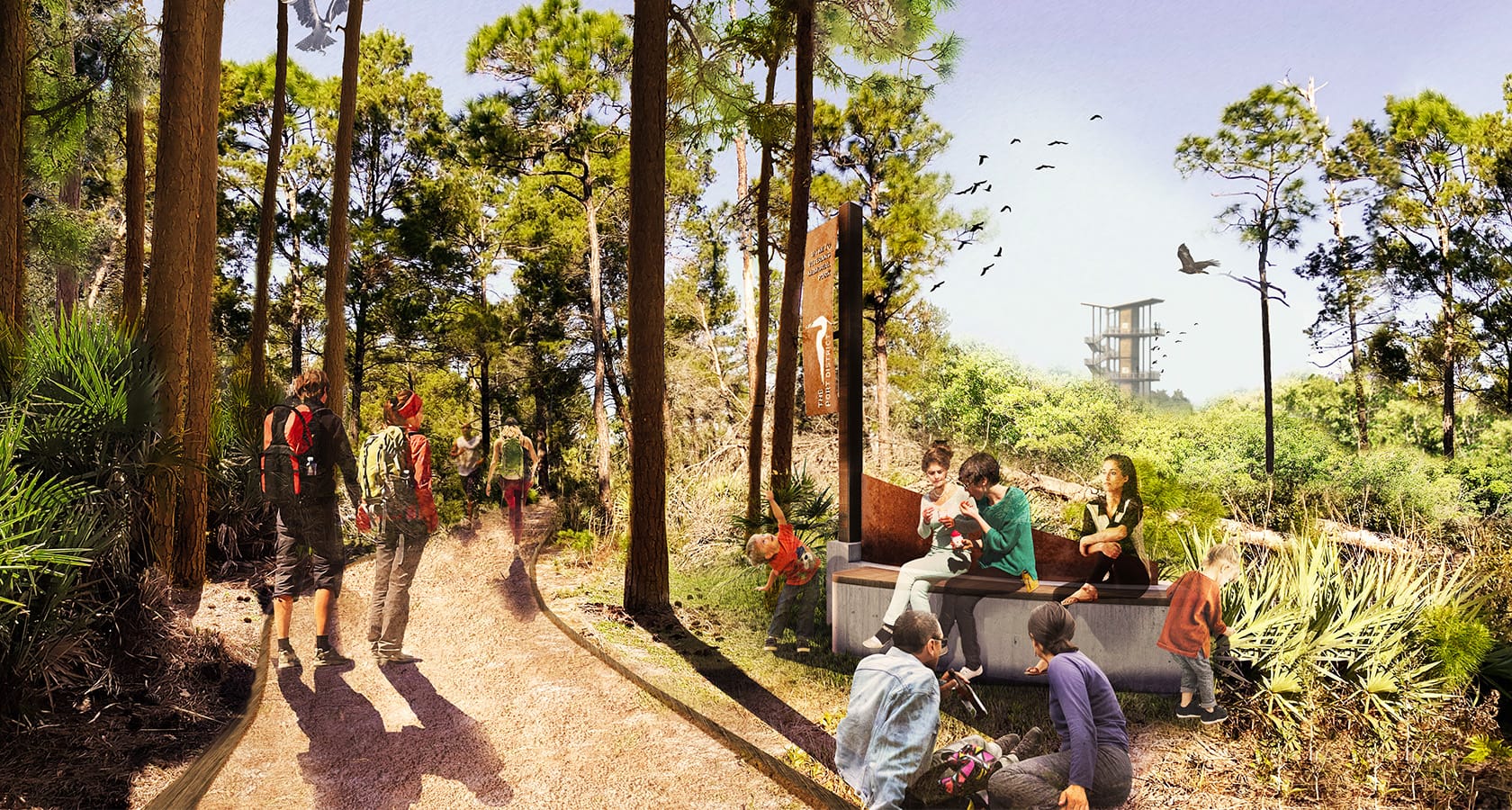 The vast conservation land and presence of federally- and state-protected species, many of which are unique to the region, present a meaningful way to culturally connect to the ecosystem. The master plan identified opportunities to embed environmental education throughout the district using signage, wayfinding, and monumentation.