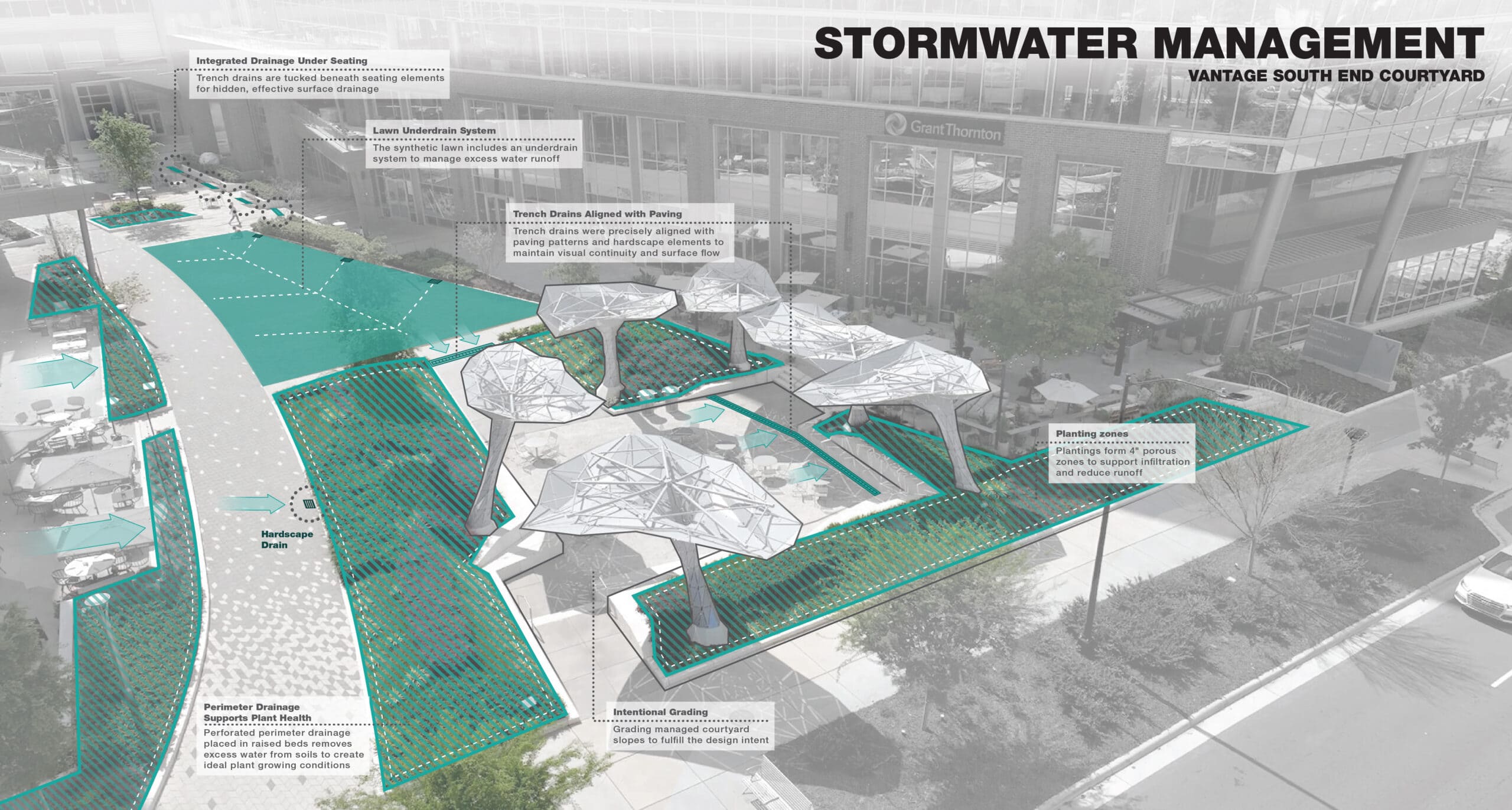 To achieve this, LandDesign’s civil engineers and landscape architects worked in close collaboration to integrate infrastructure seamlessly into the design. Utilities were relocated underground along the primary edges of the development, preventing visual distractions and preserving the pedestrian experience. Additionally, a large transformer was discreetly incorporated into the parking deck, creating a dedicated utility yard without impacting usable space. Hidden below the surface, a multi-layered drainage system was incorporated, featuring a 60-inch outfall pipe and detention sized for a 50-year storm to effectively manage runoff. Surface systems such as trench drains, underdrains, and integrated planter drainage work in harmony with the underground infrastructure, blending seamlessly into the site’s design. Together, these technical strategies ensure long-term performance and everyday comfort, creating a public realm that functions as beautifully as it looks.