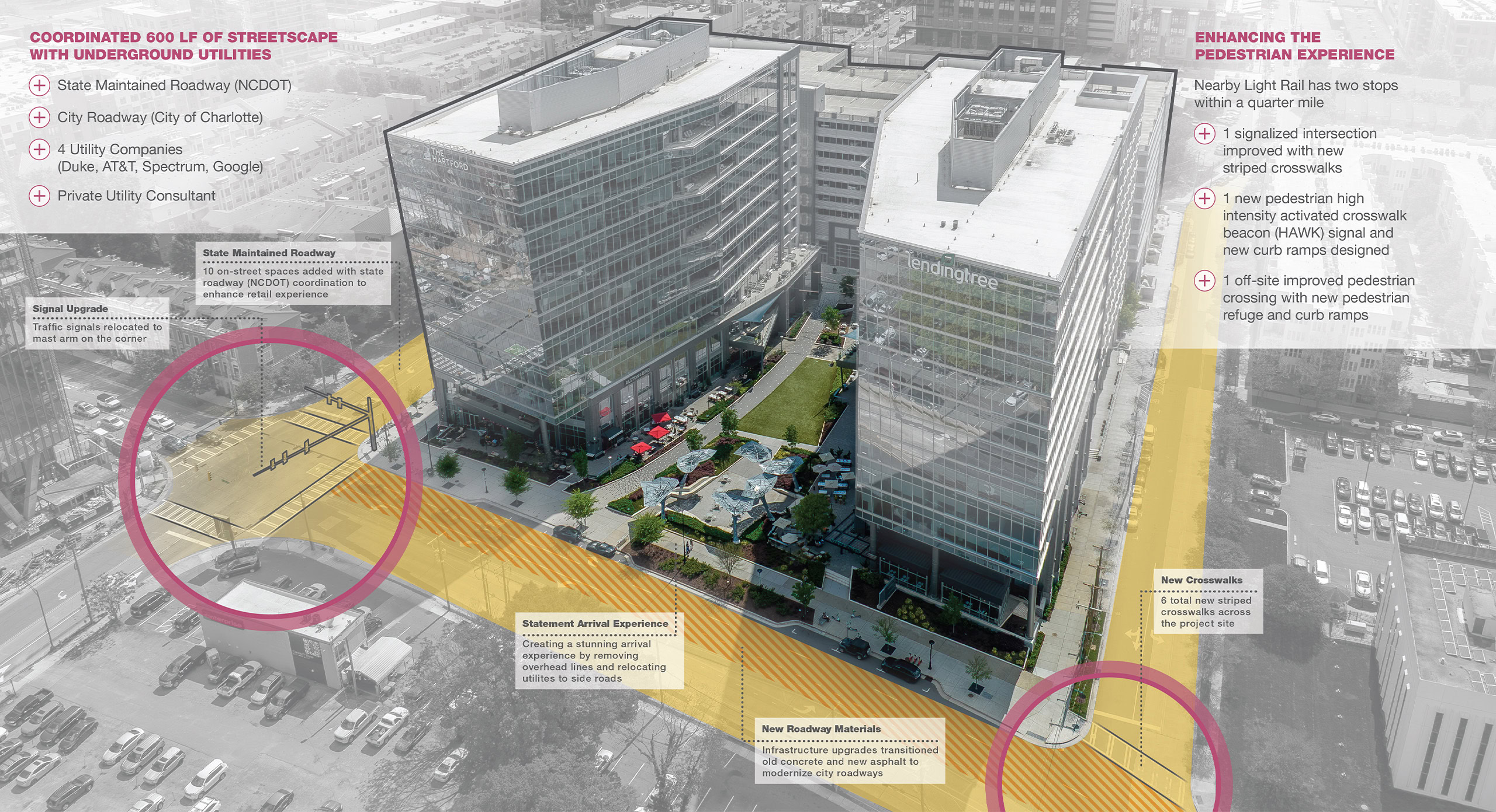 Critical transportation improvements included 600 linear feet of new public streetscape with underground utilities, six crosswalks, upgraded traffic signals with mast arms, a discreet parking garage, and 10 NCDOT-coordinated on-street parking spaces to support retail tenants and activate the public realm.