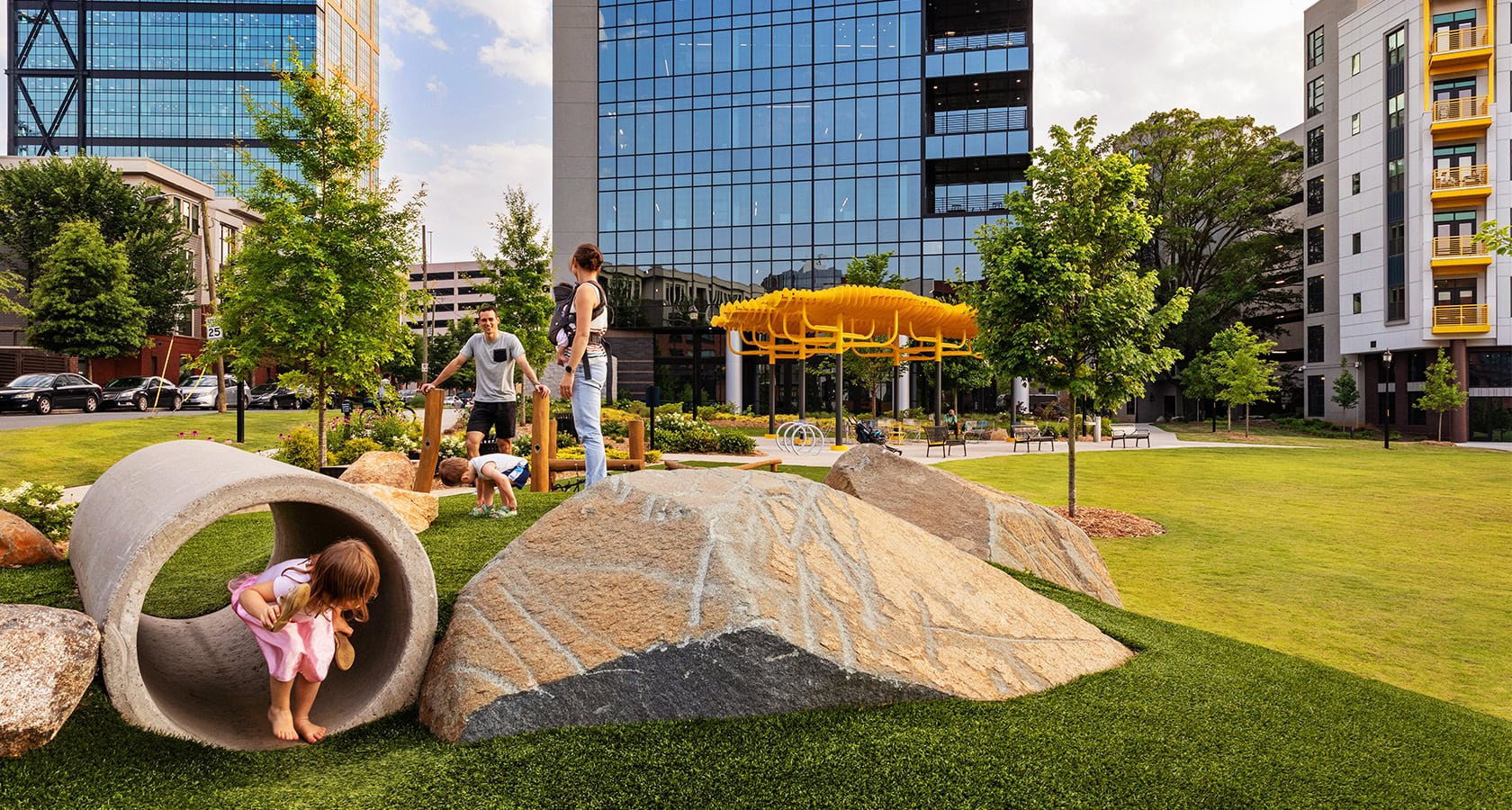 The site presented its own challenges as the 1.16-acre park was located at the corner of two major roadways and featured 16 feet of grade change from end-to-end. While these obstacles proved to be challenges for accessibility and construction costs, they provided unique opportunities for visibility and programming. A circular lawn serves as the park’s signature element as it unifies amenities and mitigates the impact of extreme grade change. At the park’s highest elevation sits the seating area, which provides picturesque views of the park and central proximity to surrounding commercial development. A small play area is also located at the highest elevation, giving it high visibility and a location that protects against the heavy traffic of the busy streets. To minimize the use of retaining walls, the gardens and the lawn terrace down to the adjacent streets, flanked by wide pathways that provide universal access for multiple modes of pedestrian movement. The park is graphic by design and programmed to fit the needs of a variety of users, creating opportunities for residents, employees, and passersby to enjoy the park from every angle.